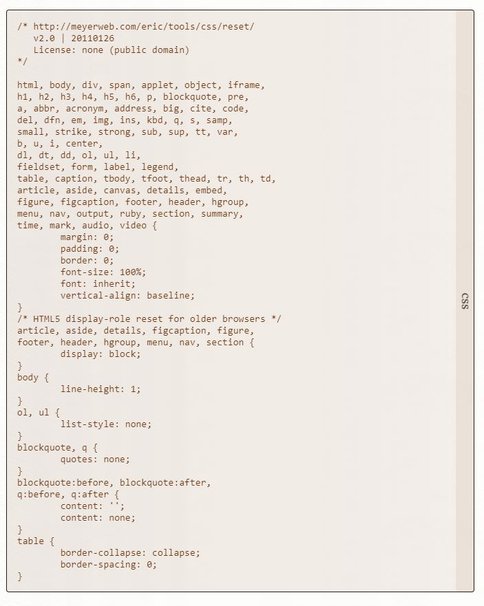 reset.css를 이용한 초기 설정은 reset.css에 들어가서, 홈페이지 중앙에 나와있는 css 코드를 복사하여 자신이 설정한 디렉토리 안에 있는 css 파일에 붙여놓기 하면 된다.