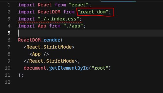 빨간색 박스가 그려져있는 줄을 해석하자면, react-dom이라는 라이브러리에서 ReactDom 클래스를 가져온다(import)는 뜻을 가진다. 6번째 줄을 보면, 가져온 ReactDom 클래스에 있는 렌더 함수를 이용해서 documnet 페이지에 있는 id가 root라는 요소를 가지고 와서 그 요소에 root 컴포넌트를 연결시켜 주고 있다.