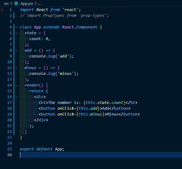 class 내부에 add function과 minus function을 작성해주자. 이 두 function은 react의 기법이 아니라 javascript 그 자체 이다. 이 두 function의 코드블럭에 기능을 구현하는 내용은 다음 포스트에서 다루기로 하고 우선 add function에는 console.log("Add") 그리고 minus function에는 console.log("minus")를 넣어주자, 그리고 이를 우리는 어떻게 쉽게 호출할 수 잇을까 ? <button>으로 가자, button에는 onClick이라는 prop이 기본적으로 있다. 이건 react magic이긴 함. javascript에서는 다른 onClick이나 eventListner를 등록해야하는데, 여기 react에서는 자동적으로 주어진 onClick을 가지고 있다. 이제 누군가가 button을 클릭할 때, 우리는 thit.add 또는 this.minus를 실행할 것이다. 코드를 봐보자.