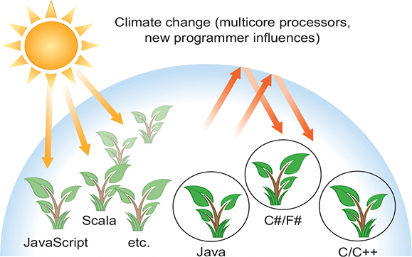 자바는 출발이 좋았다. 즉, 처음부터 많은 유용한 라이브러리를 포함하는 잘 설계된 객체지향 언어로 시작했다. 자바는 처음부터 스레드와 락을 이용한 소소한 동시성도 지원했다. 코드를 JVM 바이트 코드로 컴파일하는 특징(그리고 모든 부라우저에서 가상 머신 코드를 지워하기) 때문에 자바는 인터넷 애플릿 프로그램의 주요 언어가 되었다. 또한 자바는 다양한 임베디드 컴퓨팅 분야(스마트카드, 토스터, 셋톱박스, 자동차 브레이크 시스템 등)를 성공적으로 장악하고 있다.
