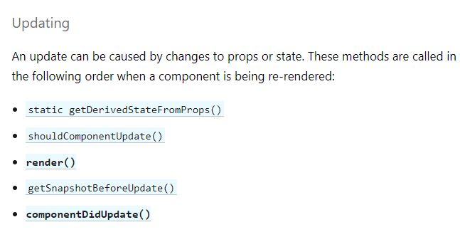 따라서 setState를 호출하면, component를 호출하고, 먼저 render를 호출한 다음 업데이트가 완료되었다고 말하면 componentDidUpdate가 실행되는 것이다.