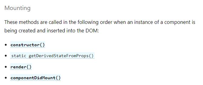 Mouting은 태어나는 것과 같다. constructor은 react에서 나온 것은 아니고, 자바스크립트에서 class를 만들 때 호출되는 것이다. constructor은 시작 전에 호출되고 그 후 render가 호출되는 식이다.