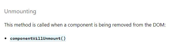 우린 component가 죽을 때, componentWillUnmount를 호출할 수 있다. 즉, componentWillUnmount는 component가 떠날 때 호출 된다.